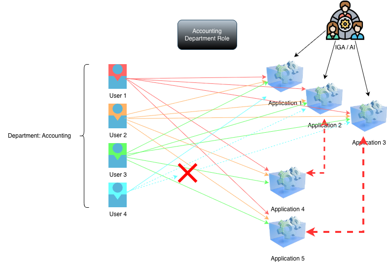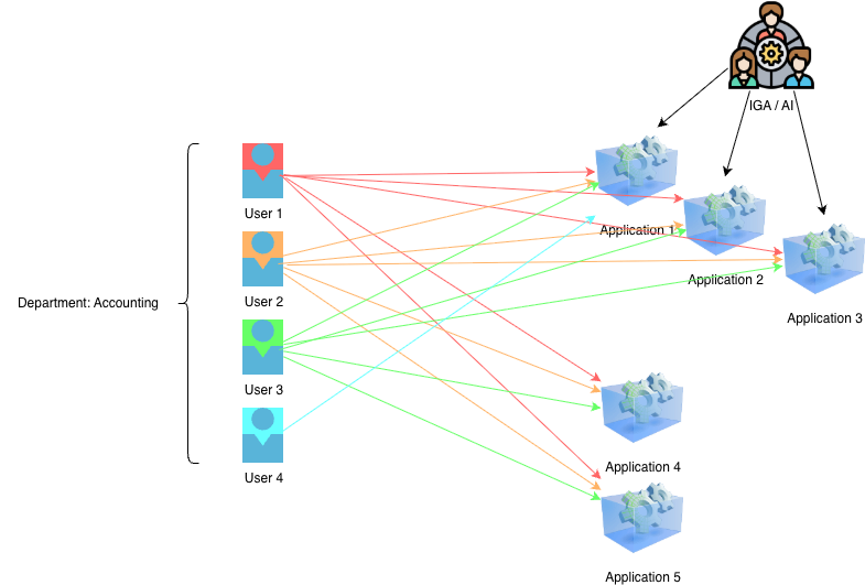 To show what I mean by this, here is a [small] example of a target department and set of applications. Now, this is a super simple example, but you have four users, five applications, and IGA platform controlling access to three of the applications. Users 1-3 have access to all applications (even though IGA doesn’t know about 4 and 5). User 4 has access to just application 1. BUT all users are in the Accounting department.