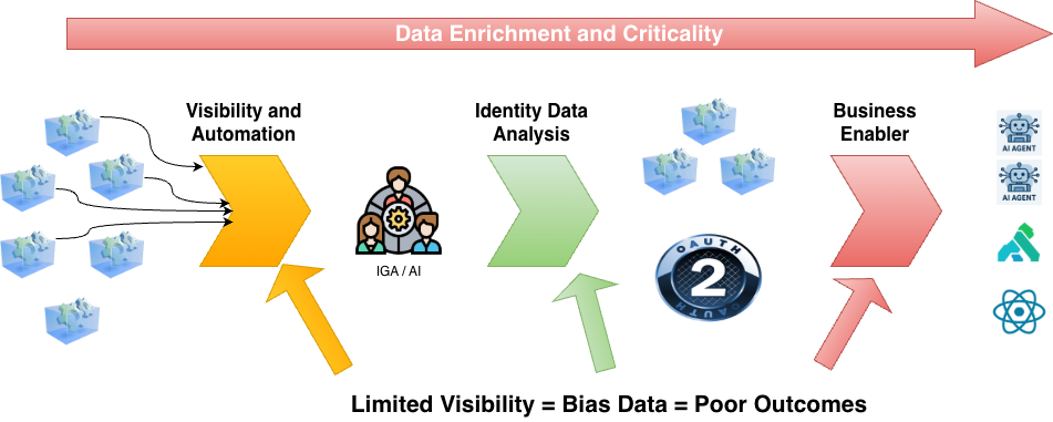 I bring this up because as we evaluate AI technology and use cases, we also need to be very cognizant of how we are getting and using the data to present it to our customers (the business enablement). As organizations look to start adding Ai capabilities, you need to look at all the main areas of AI and IAM. I am reordering based on the above in terms of focus and quality to derive informed outcomes and use cases.
